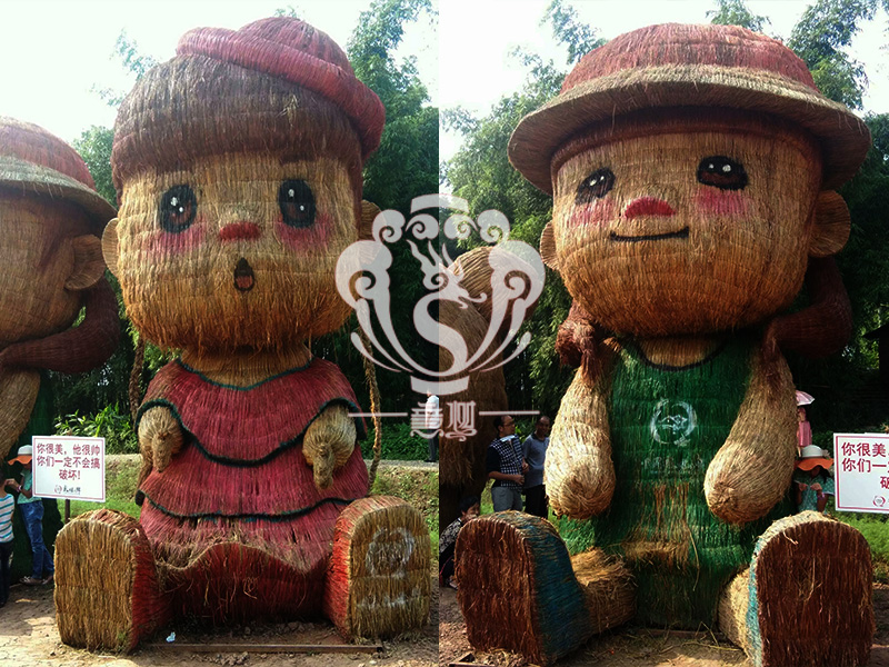 現(xiàn)在的精致稻草人藝術(shù)通常是由專業(yè)美術(shù)老師的造型放樣,然后由焊工師傅焊接出立體造型造型,然后以稻草或者稻草繩為材料編捆制作而成。