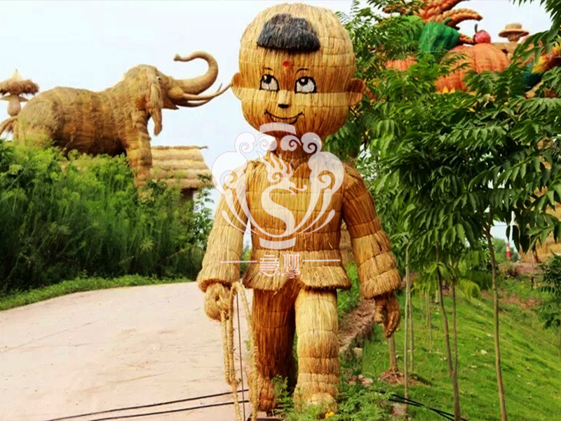 現(xiàn)在的精致稻草人藝術(shù)通常是由專業(yè)美術(shù)老師的造型放樣,然后由焊工師傅焊接出立體造型造型,然后以稻草或者稻草繩為材料編捆制作而成。